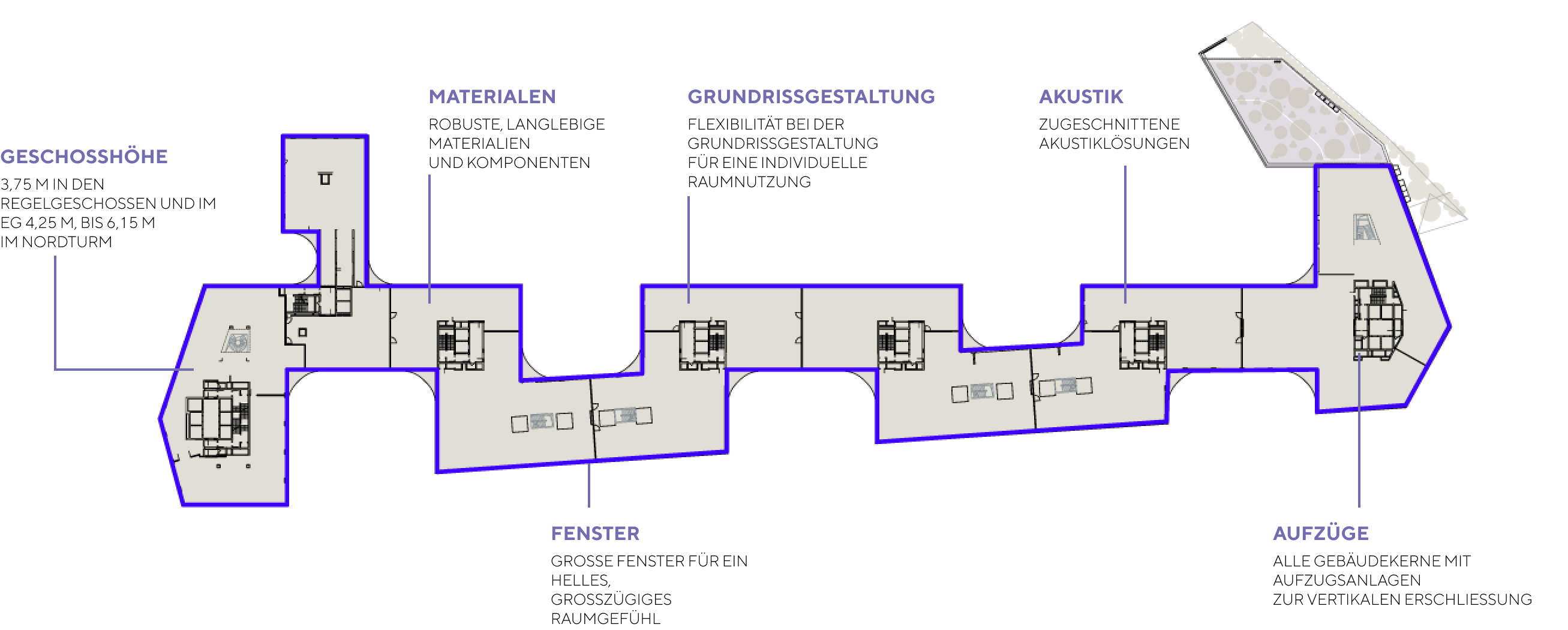 alle Gebäudekerne mit Aufzugsanlagen zur vertikalen Erschließung